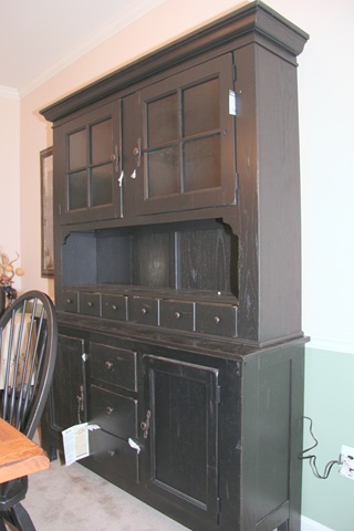 I'm sooooo excited about my new china hutch. I had been wanting to get another Broyhill Attic Heirlooms piece to add to my dining room set. So, I told Charlie that I wanted the hutch for my Christmas / Birthday gift and he said ok. So, we went up to Westminster last Friday and ordered it. It was in stock and was delivered today. I knew that it had lights in the upper part, and it has glass doors... but the neat surprise is that the upper right hinge (see the tag sticking out) is a touch control for the lights!!!!! How cool is that? I never used the light in my old hutch cuz it was sooooo inconvenient to turn on and off. I think my buffet plate holders will fit in there nicely!!